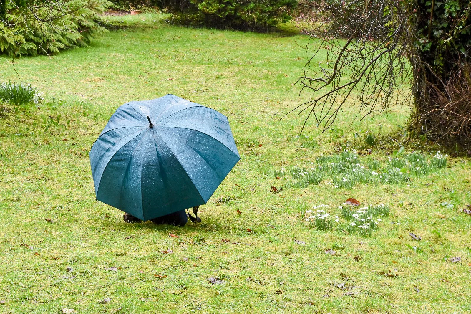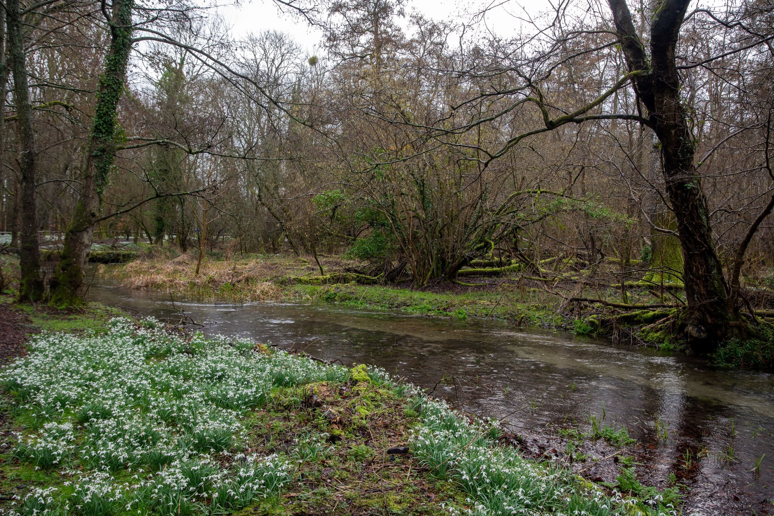It was yet another wet day in February that I visited. I’d like to see the massed snowdrops on a sunnier day. I can tell you it’s not easy photographing snowdrops whilst carrying a heavy backpack and an umbrella, trying to keep my camera dry. I had wet, muddy knees by the time we got to the pub.