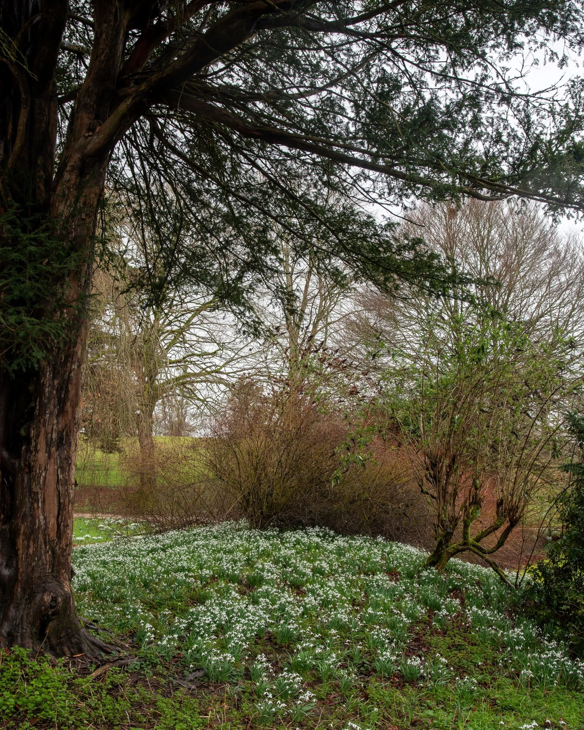 At Welford Park the snowdrops decorate around five acres of beech woodland, as well as many parts of the gardens and grassy banks, under trees and along the River Lambourne. The most common snowdrop here is Galanthus nivalis but there are reputed to be around 73 cultivars on the estate. Snowdrops enjoy damp conditions and will cross-pollinate easily, hence the large number of cultivars. I’ve written more about snowdrop cultivation here.